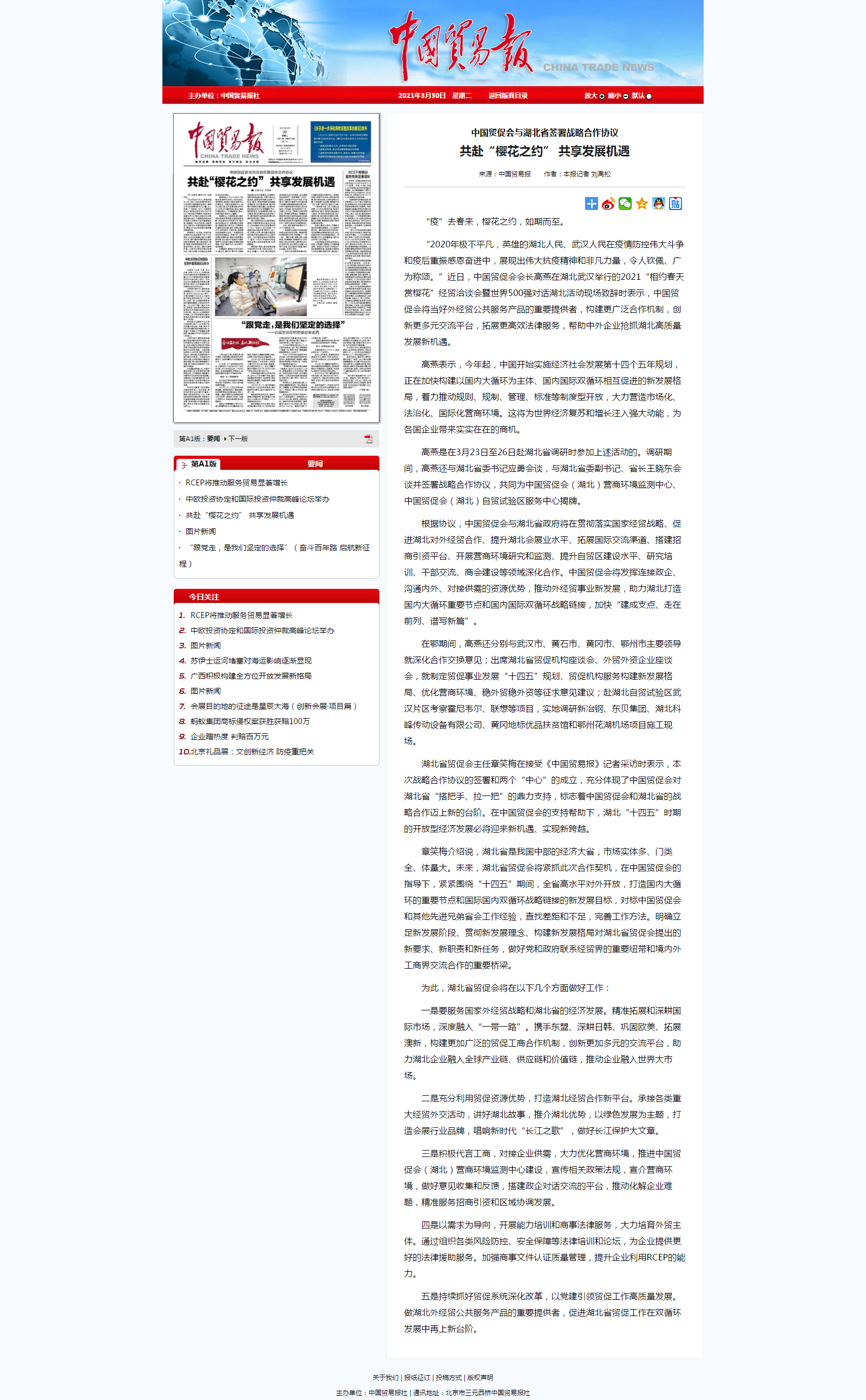 中国贸易报:中国贸促会与湖北省签署战略合作协议 共赴“樱花之约” 共享发展机遇