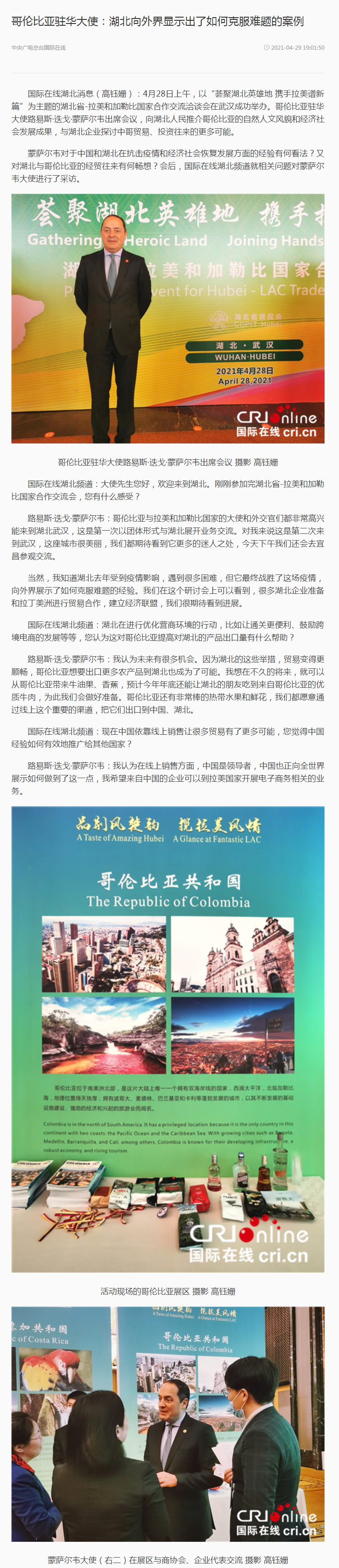中央广电总台国际在线:哥伦比亚驻华大使:湖北向外界显示出了如何克服难题的案例