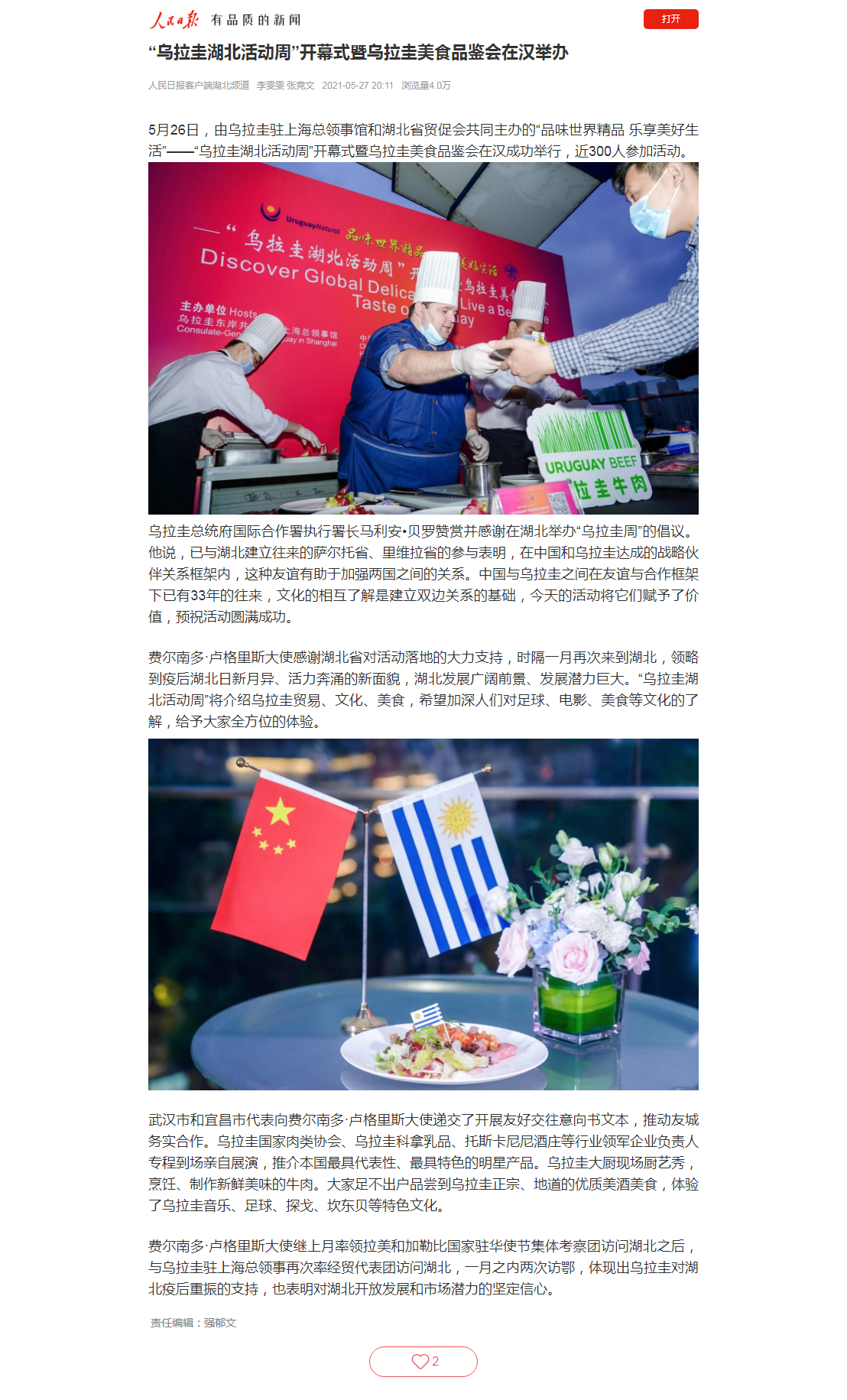 人民日报:“乌拉圭湖北活动周”开幕式暨乌拉圭美食品鉴会在汉举办