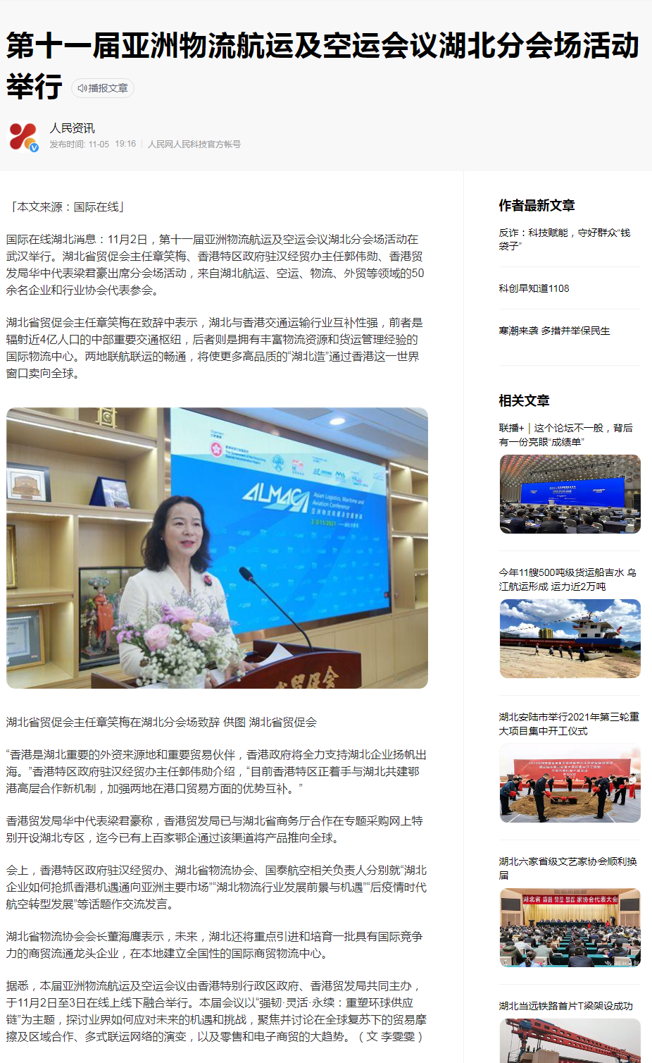 人民网:第十一届亚洲物流航运及空运会议湖北分会场活动举行