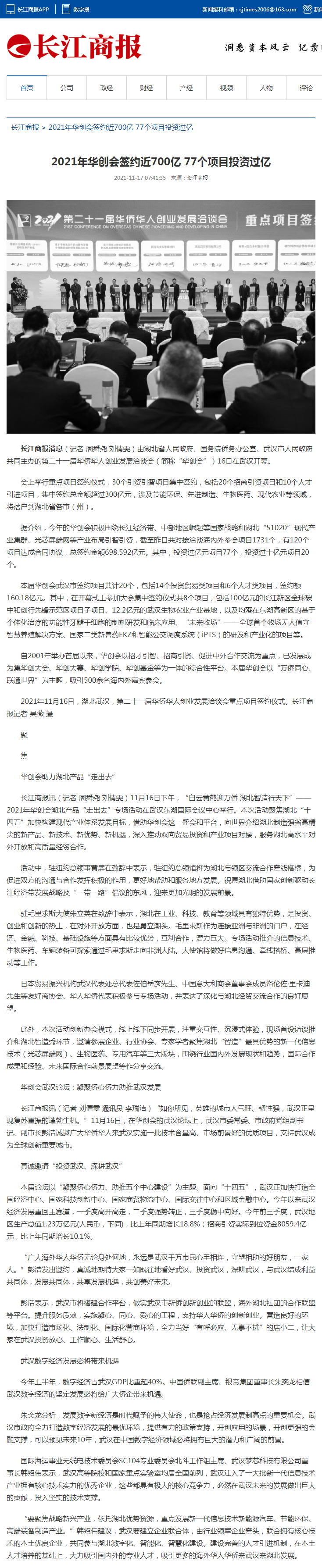 长江商报:2021年华创会签约近700亿 77个项目投资过亿 华创会助力湖北产品“走出去