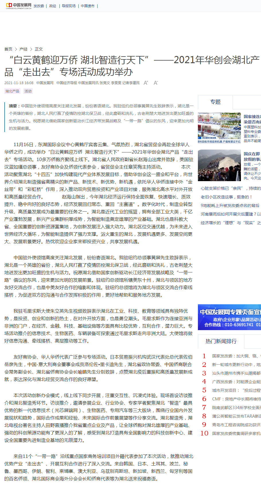 中国经济导报:“白云黄鹤迎万侨 湖北智造行天下”——2021年华创会湖北产品“走出去”专场活动成功举办