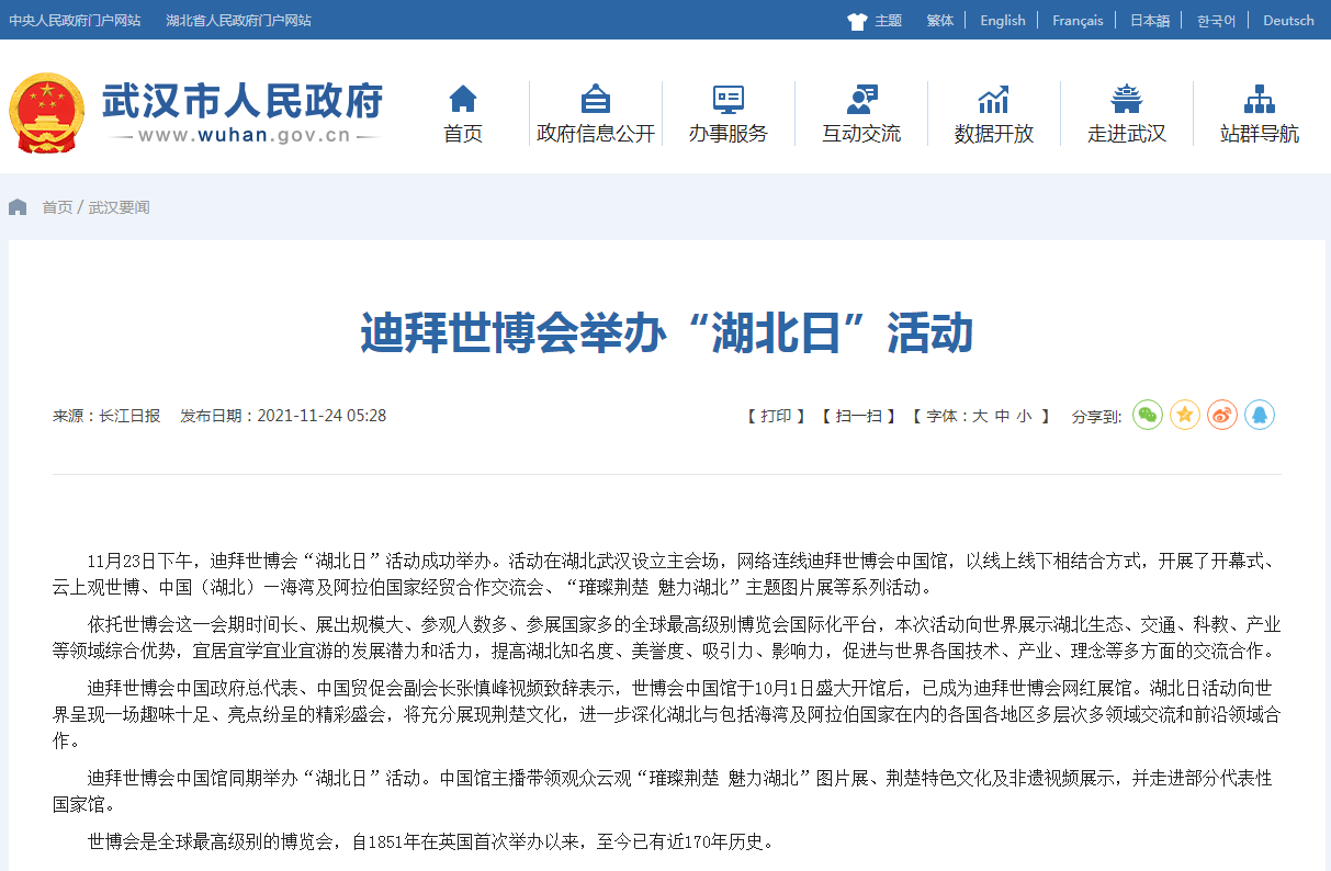 武汉市政府门户网:迪拜世博会中国馆开启“湖北时刻”