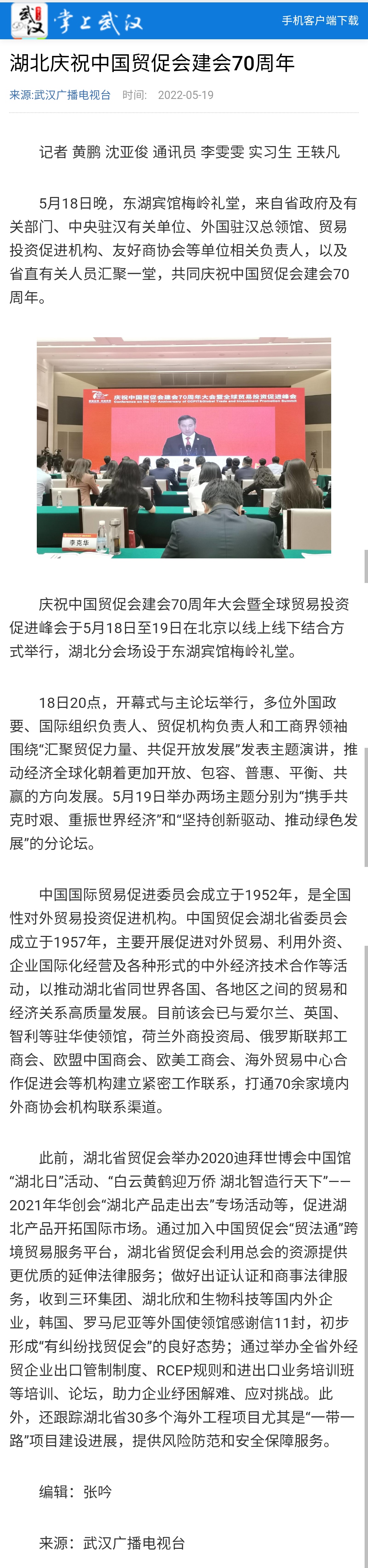 武汉电视台:湖北庆祝中国贸促会建会70周年