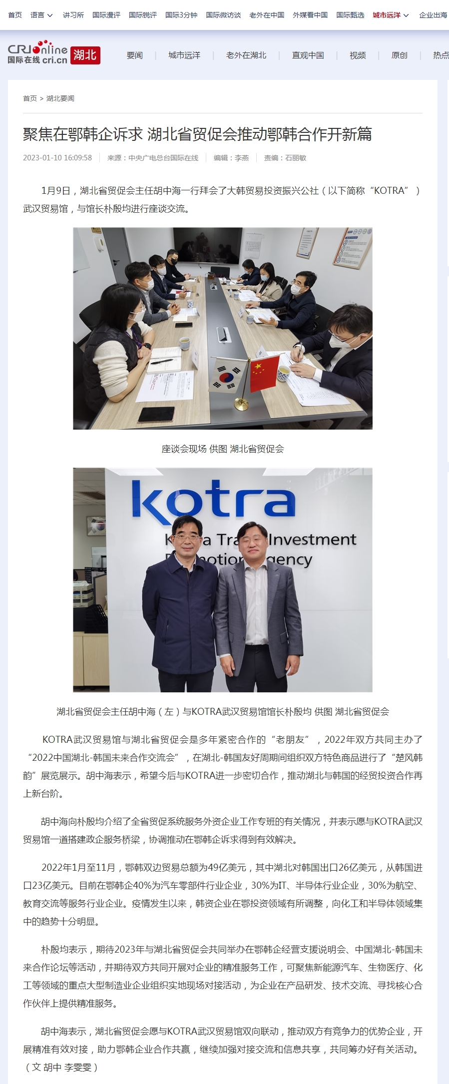 中央广电总台国际在线:聚焦在鄂韩企诉求 湖北省贸促会推动鄂韩合作开新篇