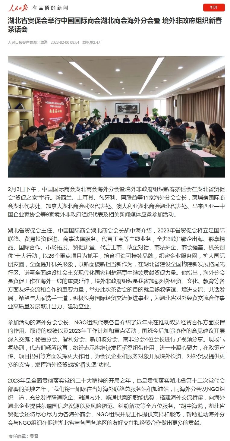 人民日报:湖北省贸促会举行中国国际商会湖北商会海外分会暨 境外非政府组织新春茶话会