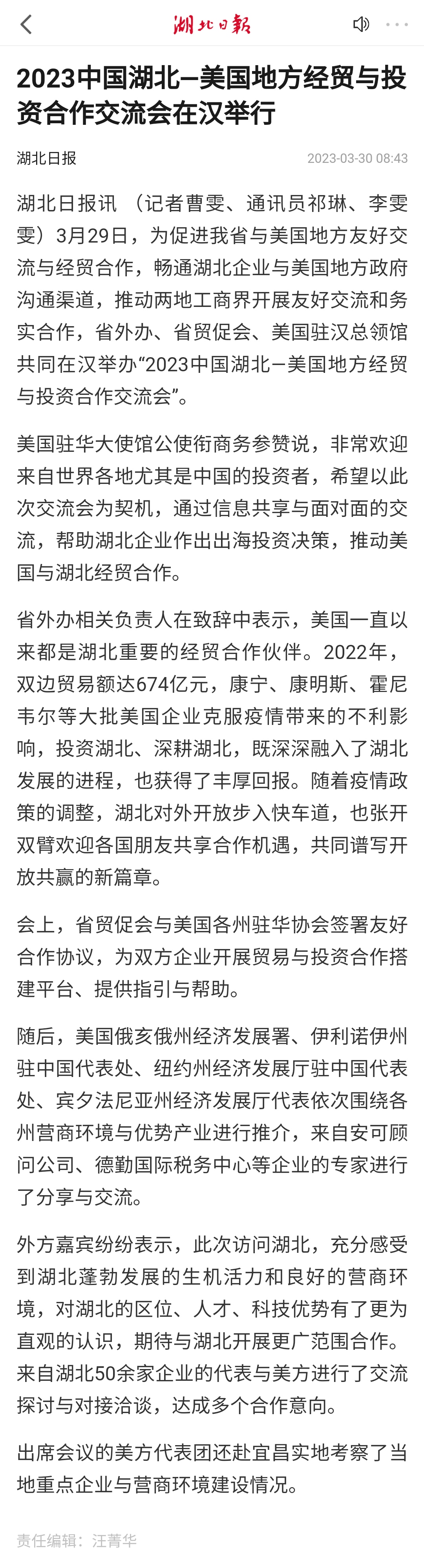 湖北日报:2023中国湖北—美国地方经贸与投资合作交流会在汉举行
