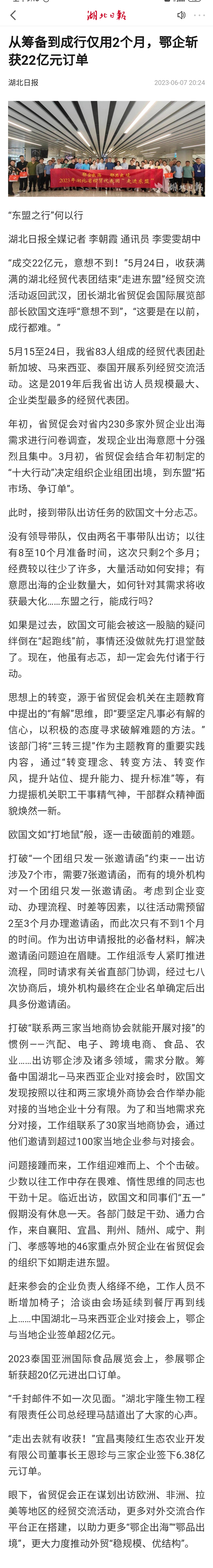 湖北日报 :从筹备到成行仅用2个月,鄂企斩获22亿元订单“东盟之行”何以行