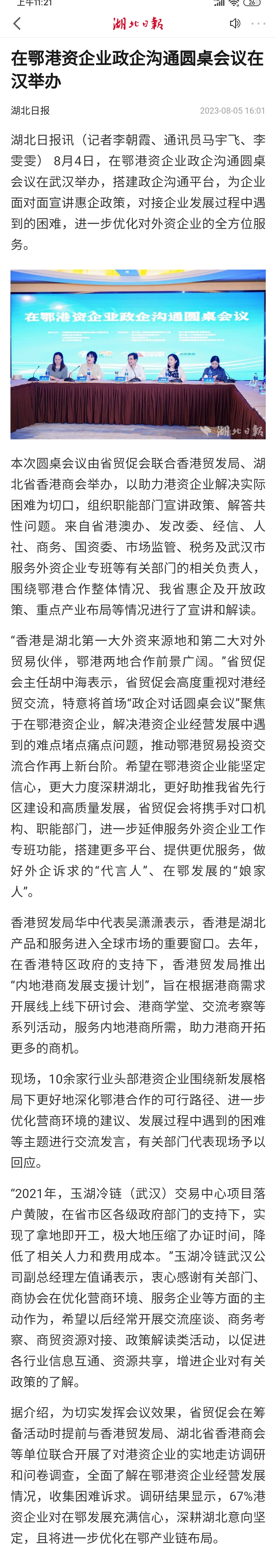 湖北日报:在鄂港资企业政企沟通圆桌会议在汉举办