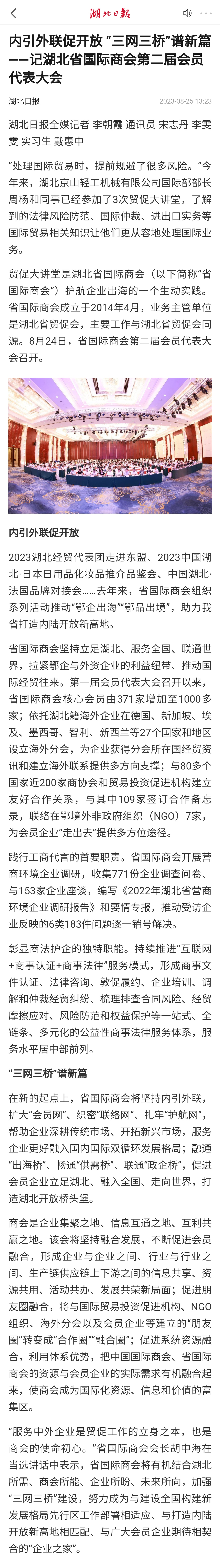 湖北日报:内引外联促开放 “三网三桥”谱新篇——记湖北省国际商会第二届会员代表大会