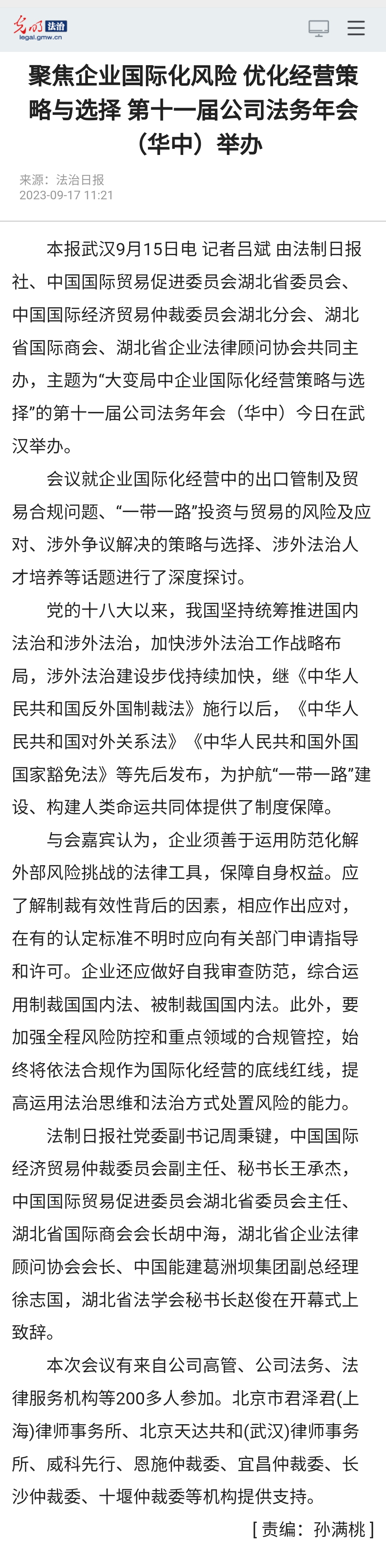 光明日报:聚焦企业国际化风险 优化经营策略与选择 第十一届公司法务年会(华中)举办