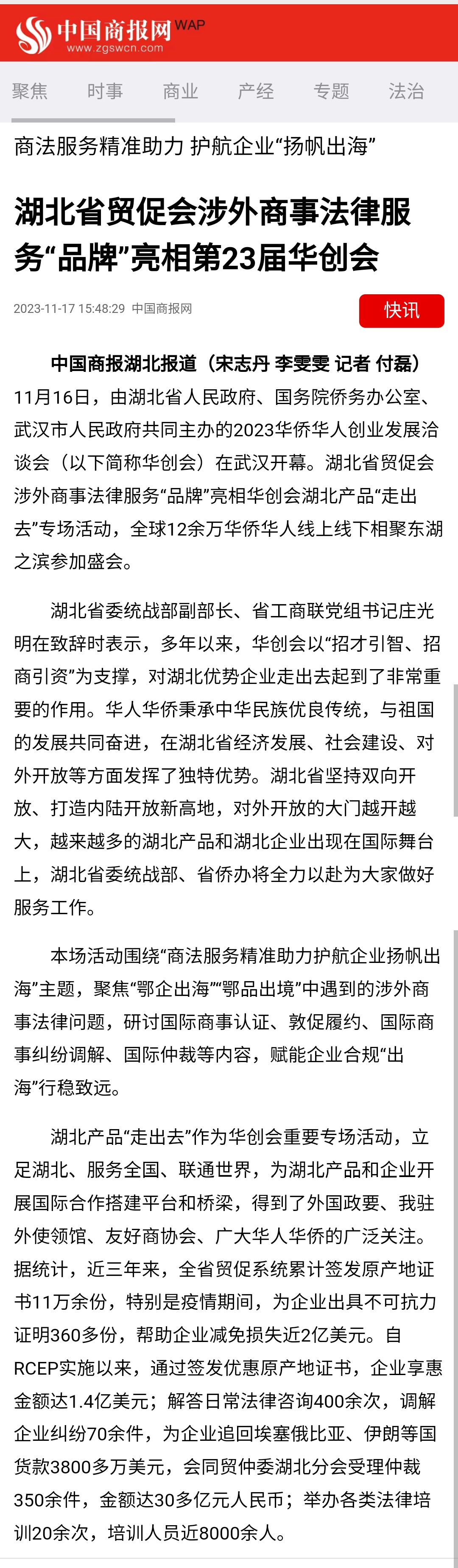 中国商报:湖北省贸促会涉外商事法律服务“品牌”亮相第23届华创会