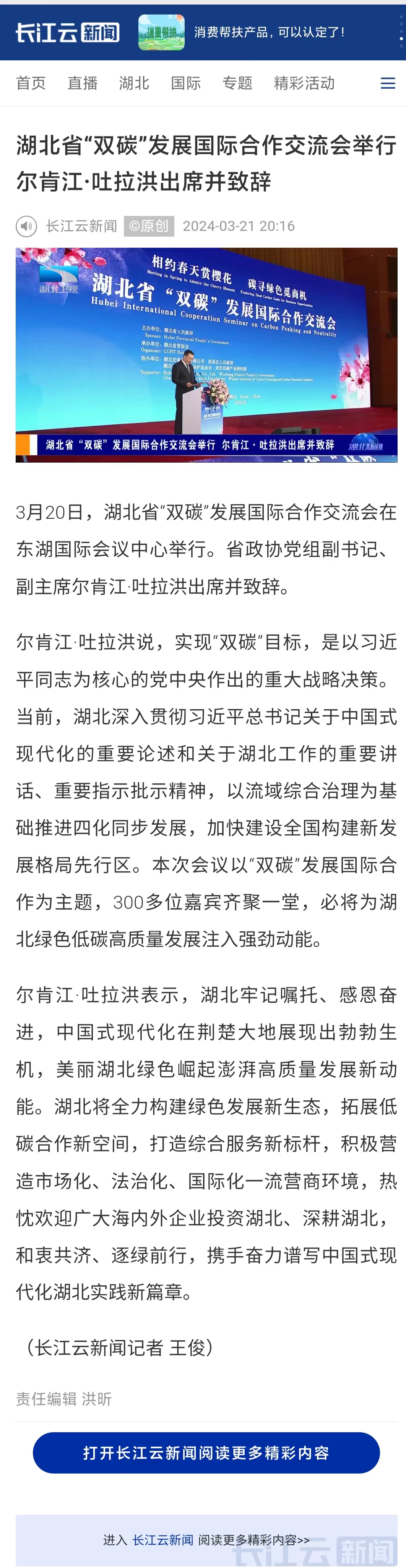 湖北卫视《湖北新闻》:湖北省“双碳”发展国际合作交流会举行 尔肯江·吐拉洪出席并致辞