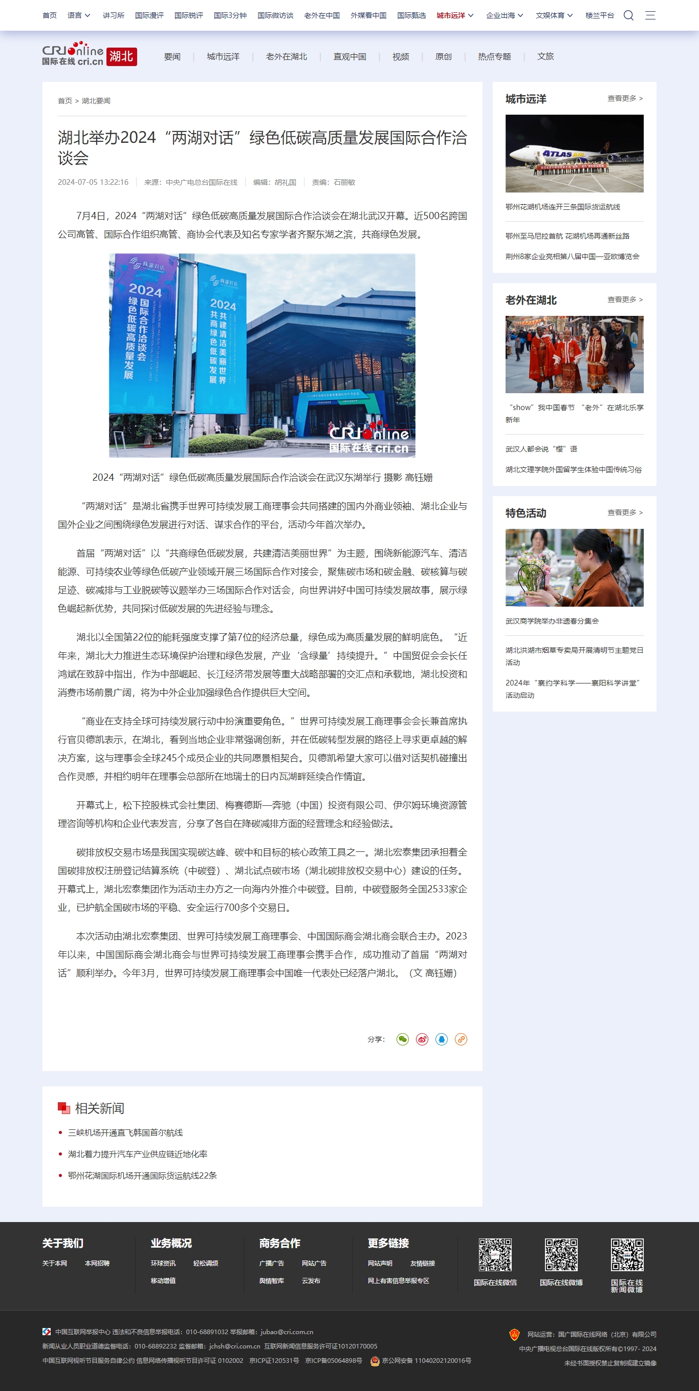 国际在线:湖北举办2024“两湖对话”绿色低碳高质量发展国际合作洽谈会