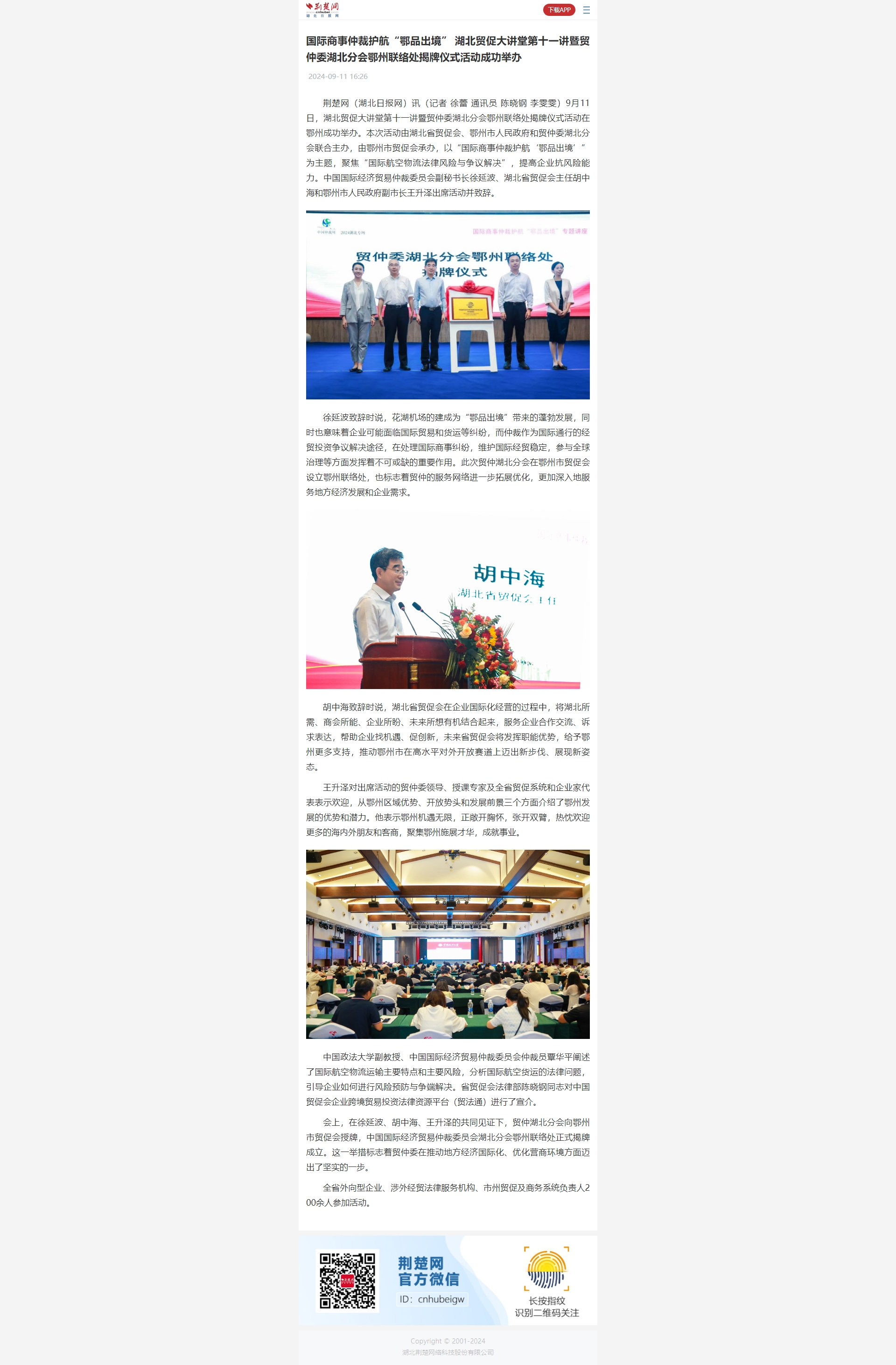 荆楚网:国际商事仲裁护航“鄂品出境” 湖北贸促大讲堂第十一讲暨贸仲委湖北分会鄂州联络处揭牌仪式活动成功举办