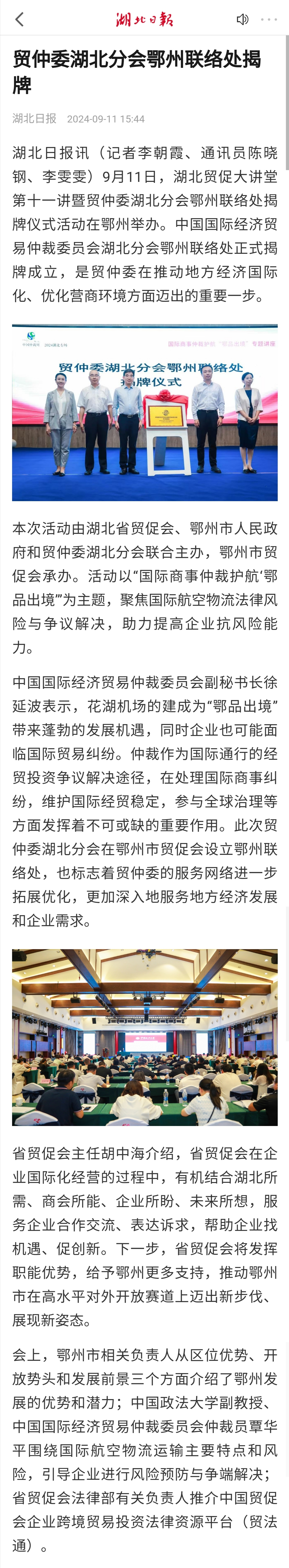 湖北日报:贸仲委湖北分会鄂州联络处揭牌