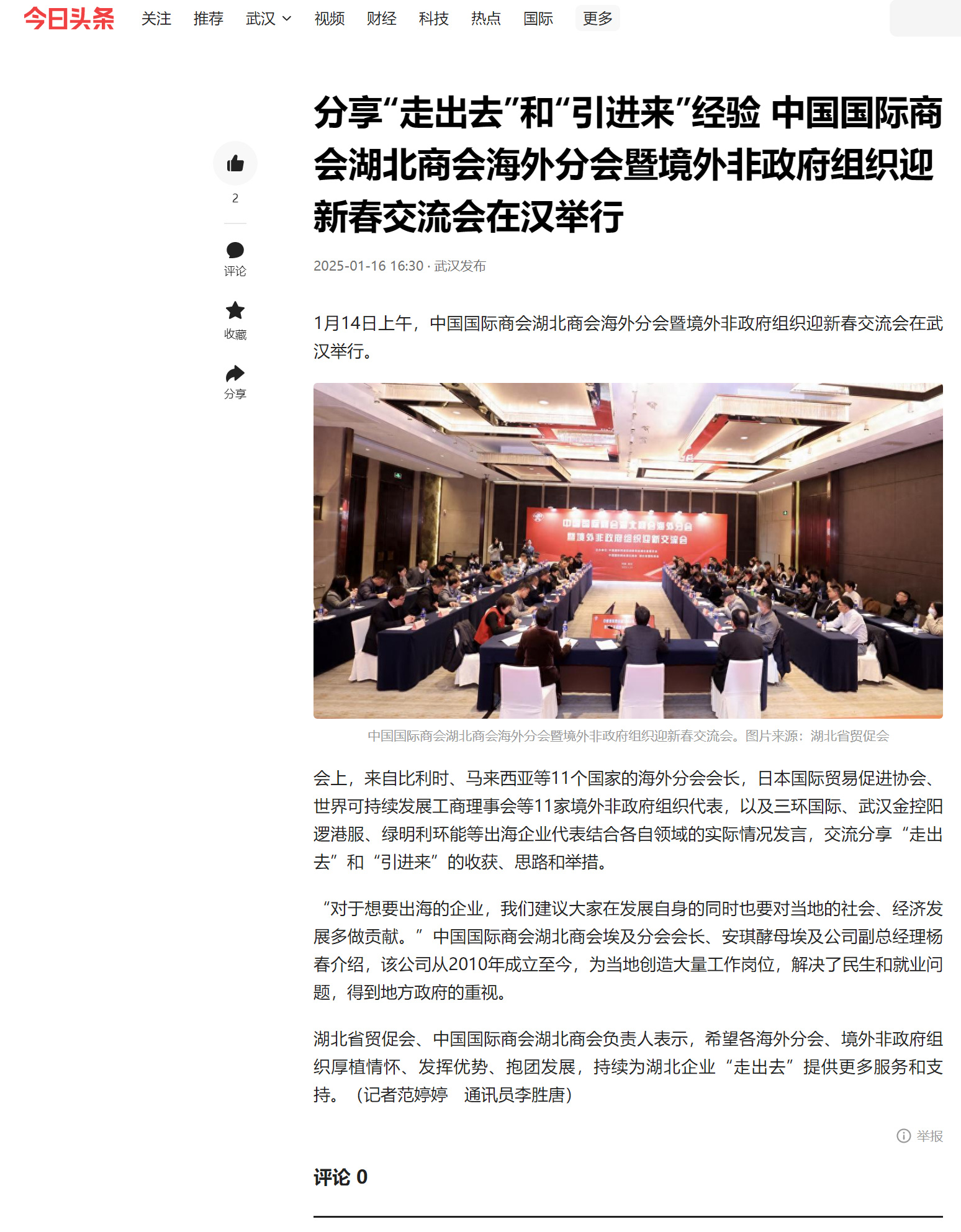 今日头条:分享“走出去”和“引进来”经验 中国国际商会湖北商会海外分会暨境外非政府组织迎新春交流会在汉举行