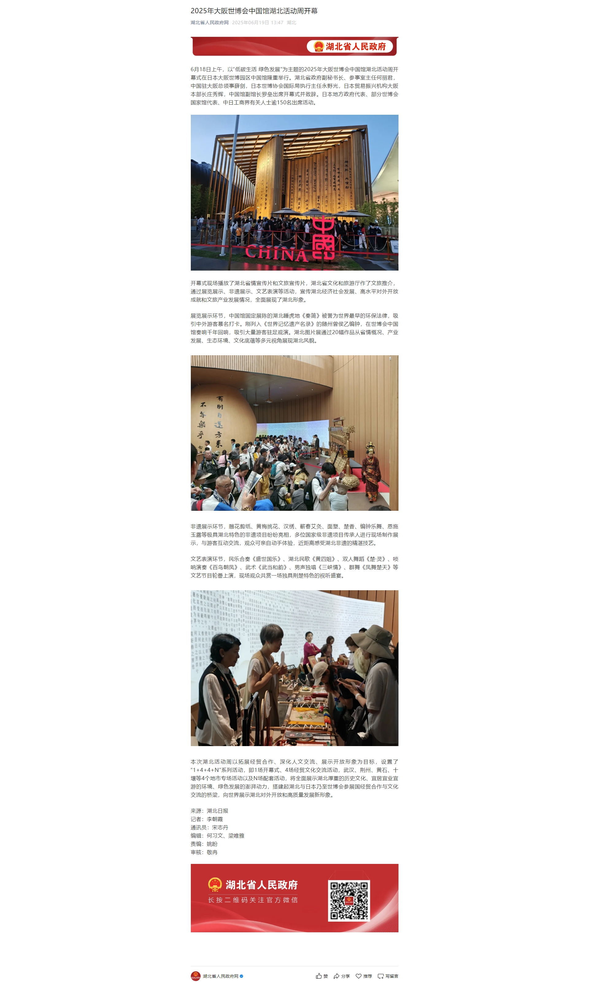 省人民政府网:2025年大阪世博会中国馆湖北活动周开幕