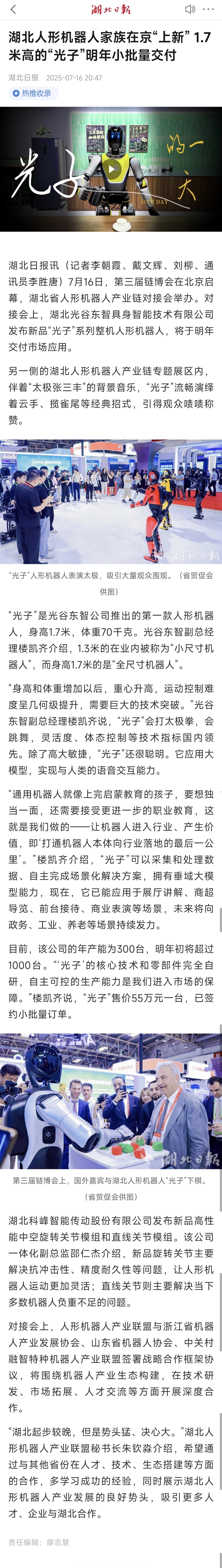 湖北日报:湖北人形机器人家族在京“上新” 1.7米高的“光子”明年小批量交付