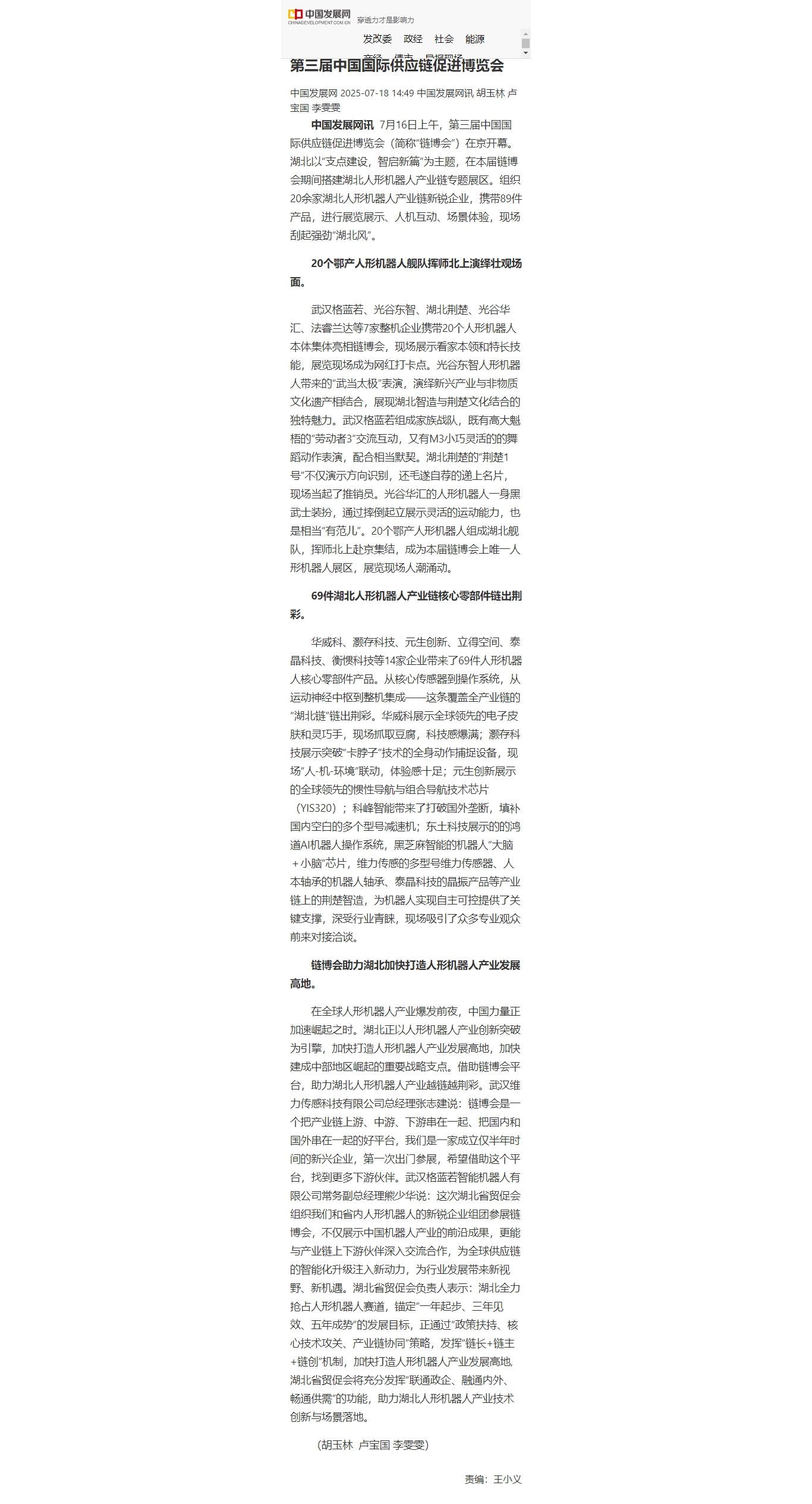 中国发展改革导报:湖北人形机器人产业链专题展“闪耀”第三届中国国际供应链促进博览会