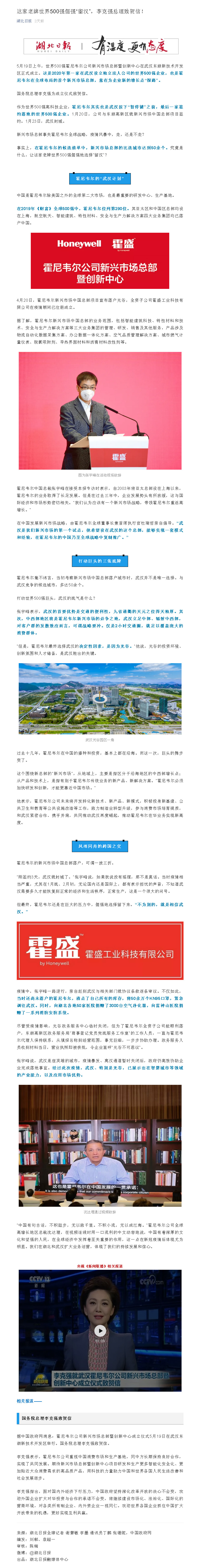 湖北日报: 这家老牌世界500强倔强“留汉”,李克强总理致贺信!