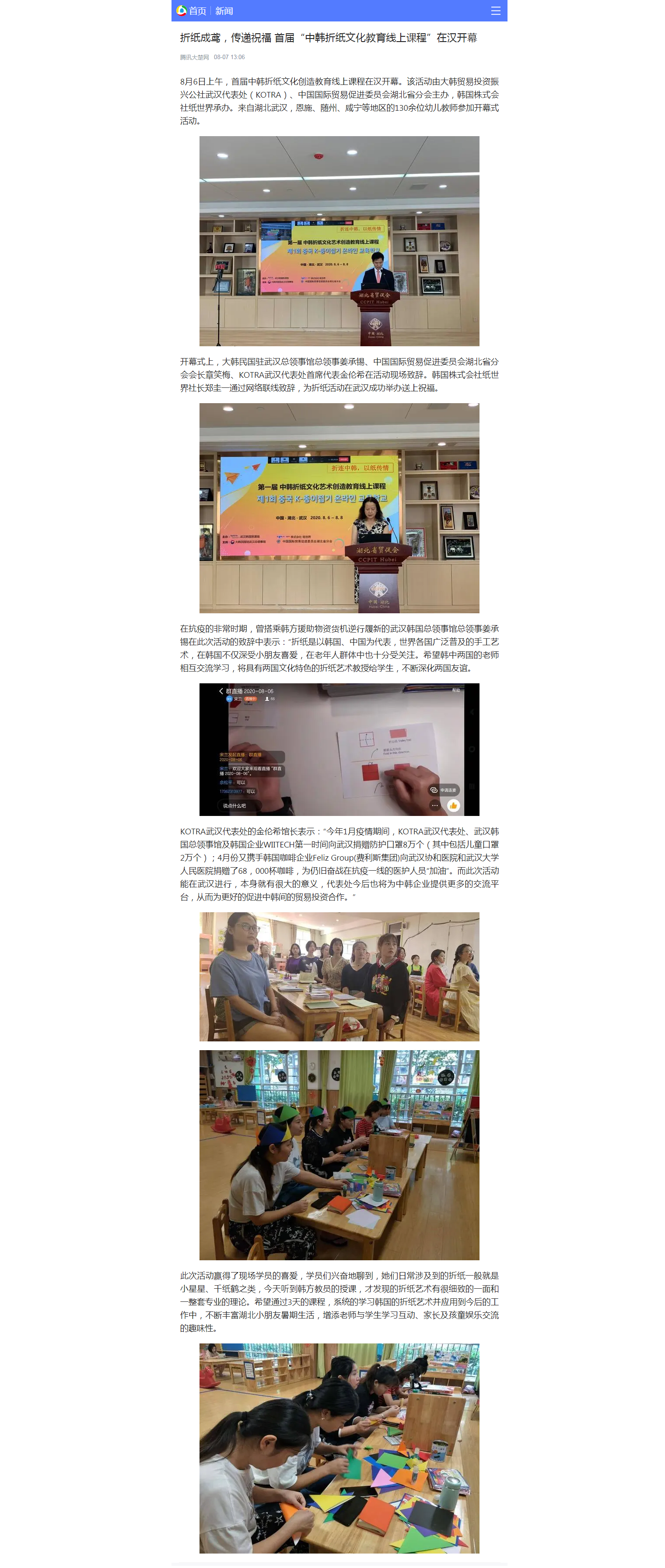 腾讯大楚网:折纸成鸢,传递祝福 首届“中韩折纸文化教育线上课程”在汉开幕