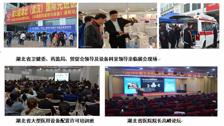 该展会由湖北省贸促会和湖北省卫健委于1985年共同创建主办,是华中地区历史悠久、行业知名的医疗例会。2019年“第35届湖北(武汉)国际先进医疗仪器设备展览会”展出面积1.5万平米。来自国外11个国家著名品牌和国内20多个省、市近400家知名厂商、5000余种产品现场展示。三天吸引专业观众15683人次,举办的《湖北省大型医用设备配置政策培训班》吸引了全省500余名院长及管理人员参会。参展品牌及企业包括:迈瑞、鱼跃、欧联恒信、国药、人福、联影、GE、安健、美诺瓦、深图、锦源、海鹰、宁泰、上海医疗、威尔德、艾迅、威高、迈迪克、澳柯玛、东华原、乐凯、一诺、美伦、江北医疗等。组委会注重实效,锐意改革创新,力争进一步提升主管部门、科研机构、生产企业、医疗诊断单位及经销商互动交流效果,以促进医疗行业发展更好服务广大群众。